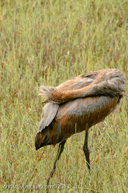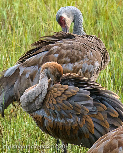 Individual cranes frequently preen their own wing and back feathers. We have never seen Millie and Roy preen one another but preening of another individual (allopreening) is common in parrots. On several occasions in September, when Millie, Roy, and Pi were preening themselves, Pi touched Millie's back feathers, seeming to investigate the uropygial (preen) gland near the base of her tail. Millie discouraged PI's investigations.
