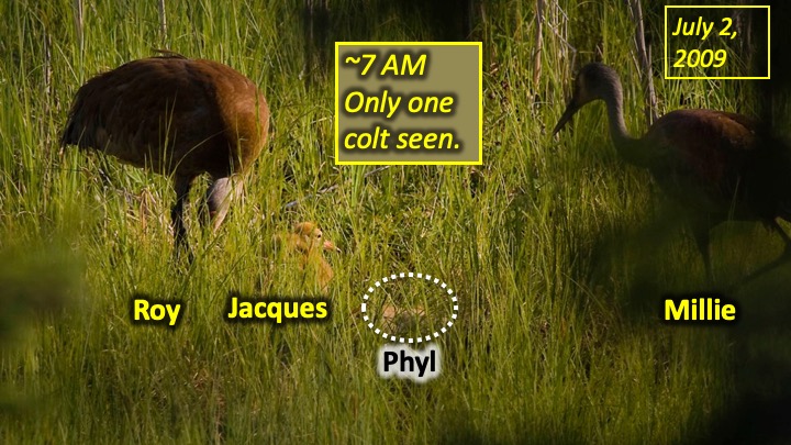 Roy and Millie returned on April 29, 2009. Two colts, Jacques and Phyl, hatched on June 10/11. At first both colts seemed to thrive, but when we looked out on the morning of the 2nd of July, the cranes standing over a feathery mass in the grass - Phyl's body. Phyl had died overnight!