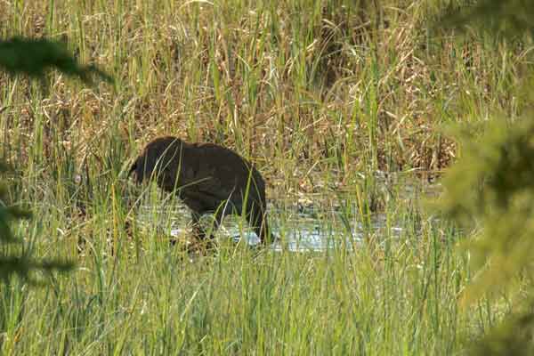 The eggs should have hatched on June 8th, but instead heavy rains fell and we saw no colts. Incubating stopped two days later. But then, both cranes began to pile marsh grasses and underwater weeds from the mucky bottom of the pond onto the nest. This piling continued until on June 14th. By then, the vegetation mound was almost one foot high. This pile caught the attention of ravens, perhaps because it was odorous?
