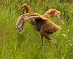Hastings was precocious. On July 5th, he presented a Droop-wing Threat display toward a squirrel. Also on that day, he began to dance with his parents. In his initial dance attempts, he fell down (see "One month old Sandhill" video) and remained a little timid for the next week but resumed dancing and flight school practice with vigor.