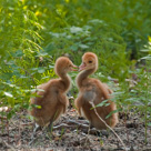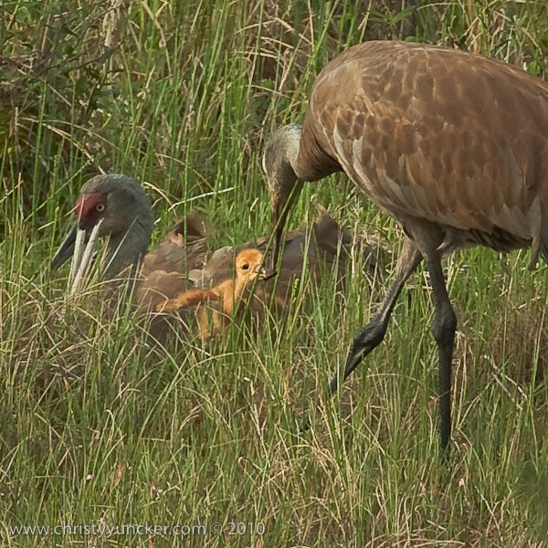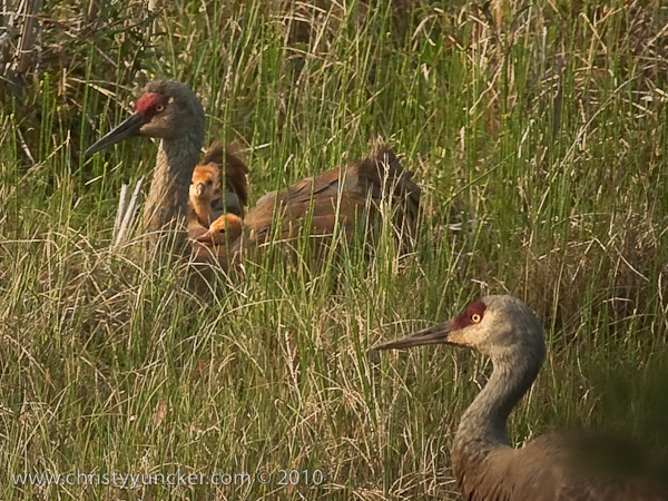 In 2010, Roy and Millie returned from migration on April 22. They began incubation on May 4 and the colts hatched on June 4 (Lucky) and June 5 (Chance). The two colts did well in their first week. By the end of the second week, Lucky (first-hatched, we think) was distinctly larger than Chance. See also Alaska Sandhill Crane Blog.