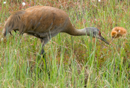• Foraging - Parents offer colts insects (small dipterans, beetles, adult dragonflies, crane-fly larvae), voles that they catch and dismember, cranberries, tubers, and grain. By the end of the week 2, colts peck at berries, grain, and leaves and may be feeding themselves, but the bulk of their food is provided by parents.