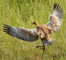 • Caution - In their first weeks, colts are especially vulnerable. The parents are particularly wary when ravens, northern harriers, or mew gulls are nearby. Whenever a predator is detected, colts crouch down in the grass, often under their mother. If the predator approaches, the parents defend vigorously, as seen in the left photograph which shows Millie shielding the colts (Jacques-09 and Phyl-09) and Roy Bill-stabbing at a mew gull. The mew gulls had nested within 30 meters of the crane nest. By midsummer, their gull chicks had become colt food and the adult gulls deserted the pond.
