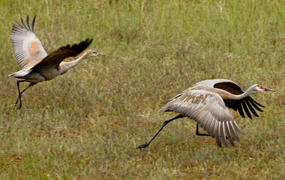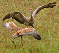 On several occasions, other groups of cranes fly over, perhaps reflecting preliminary gatherings as a prelude to staging. Roy and Millie call energetically and may take flight, with the colt, to join the "intruder cranes". It is not clear whether they are chasing the intruders or forming a transient social relationship.